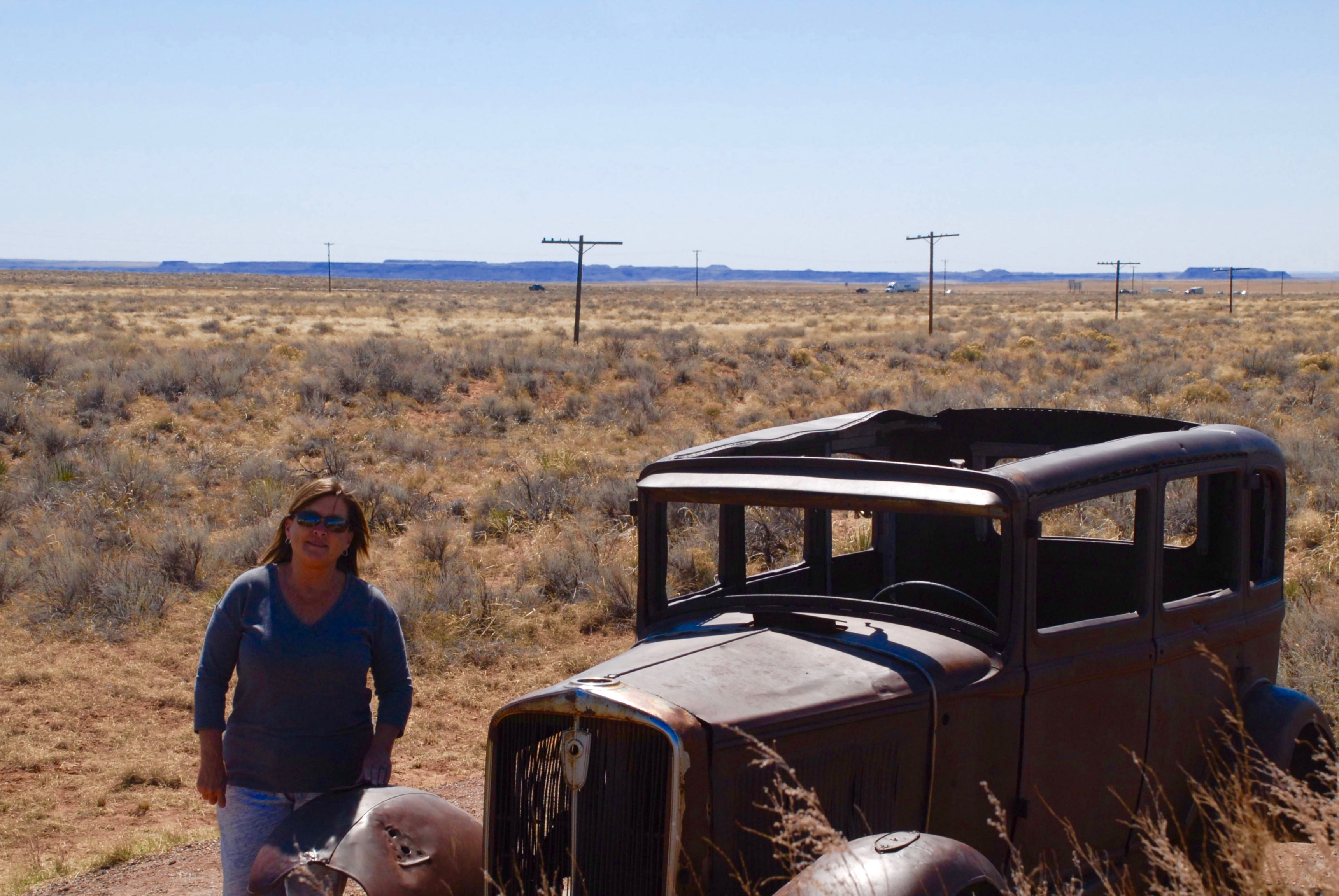 TJ next to the 1932 Cadillac on old Route 66