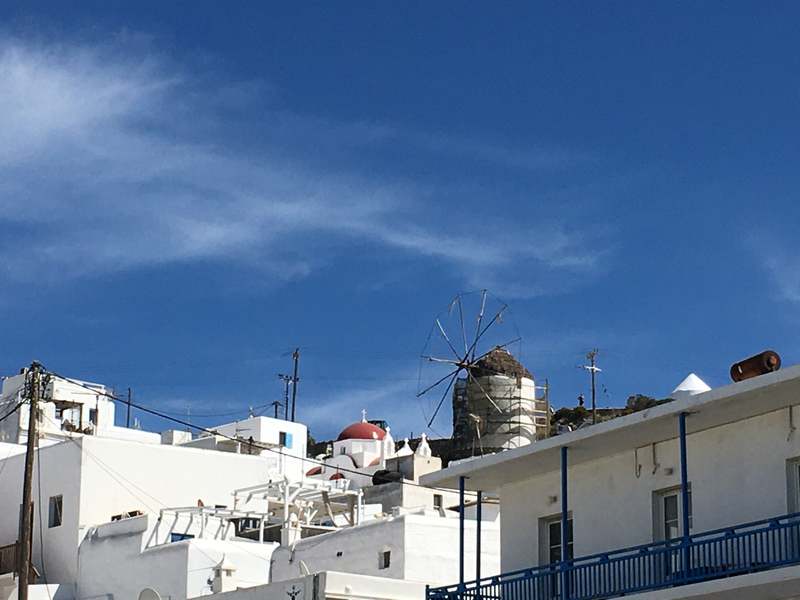 While walking or wandering through Old Town, you will eventually end up at the shoreline and if you continue on your left until you reach the end, you will see the famous “windmill” view! A short, perhaps 15-20 min. walk, depending if you stop to look at shops and attractions along the way. The windmills used to be an important part of the Islands economy and used for many centuries to grind wheat and barley into flour. Now there are six mills remaining on the hill overlooking Little Venice and an important part of local tourism.