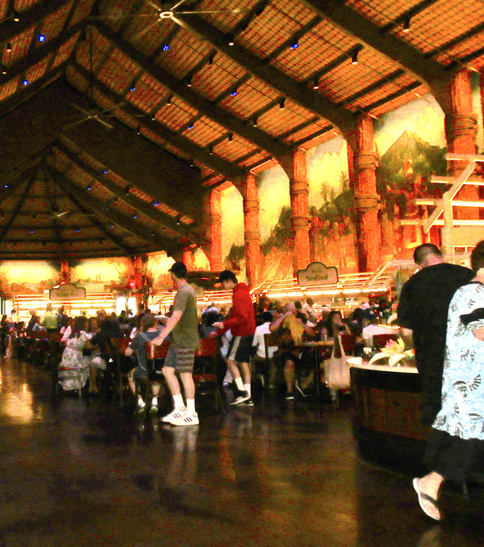 By late afternoon we were hungry enough to attack the enormous spread prepared for us at the huge restaurant, followed by a Pacific Island show including Hulu dancing and ancient rituals.