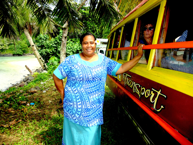 Our tour vehicle needs a separate description for readers that are not used to exotic islands and road conditions. We’re talking a 1975 or there about, chassis of a Ford/Chevy or Datsun/Toyota truck, completely rebuild with a passenger wagon, hand-built for some 12 to 16 passengers and decorated by everything that may make you feel comfortable such as curtains and kitchen items or religious relics of questionable history. The tour was only $25 per person, but on several occasions we thought the truck’s sounds indicated it was done and over with. Probably that is the charm however. The driver and his wife with an unpronounceable mile long name took us around the middle of the island with many little villages up and down the road. What’s interesting is to see that many houses have their own little graveyards, only meant for family. This is a clear indicator that communities have longevities. Samoans hold on to their circles. But the question arises after seeing a for sale sign on a house; does that include the graves? And here is where I learn something about humanity.