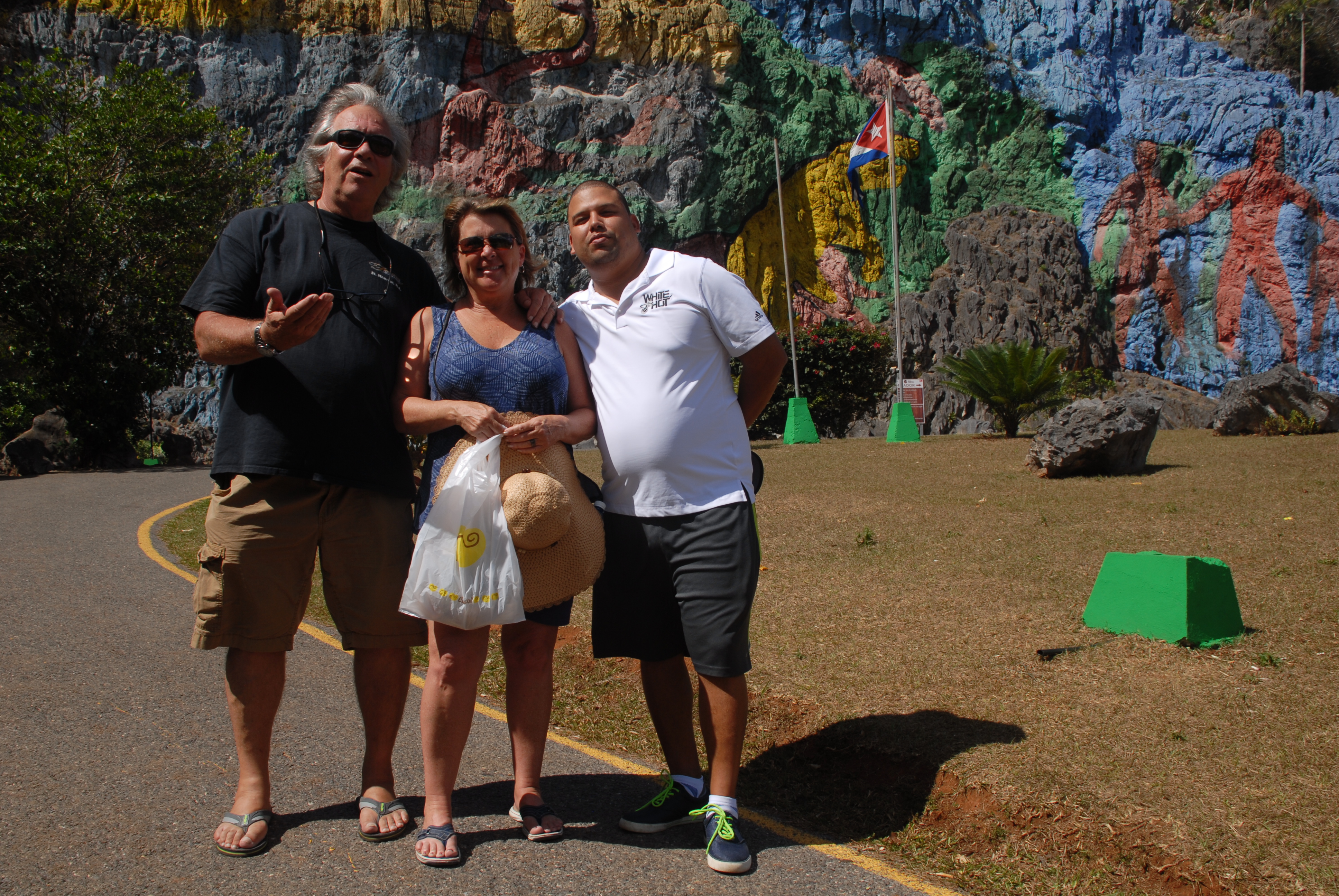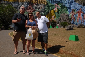 We then traveled a little further out into the countryside and visited a little bar/gift shop/cigar farm with old fashioned tobacco barns. They grow, pick, hang and roll the cigars right there. Viñales is known to be the number one area in the world to grow tobacco. Of course I had to purchase a bundle and get a picture with the very cool guy rolling the cigars. Pedro remembered him from 30 years earlier. It was all a little dreamy and magical. I admired the old plow in the barn, which apparently is still being used. In the restaurant area was a woman singing who had a charming voice too. According to Han the guy accompanying her on guitar was quite remarkable as wellL ovely, just lovely!After driving between hilltops called “The Two Sisters” we arrived at Mural de la Prehistoria. We drove up to the admissions gate and Pedro recognized a friend who was a guard there. He let us enter free of charge, but Pedro bought him and a few other guys some beers. Pedro is quite the gentleman.
