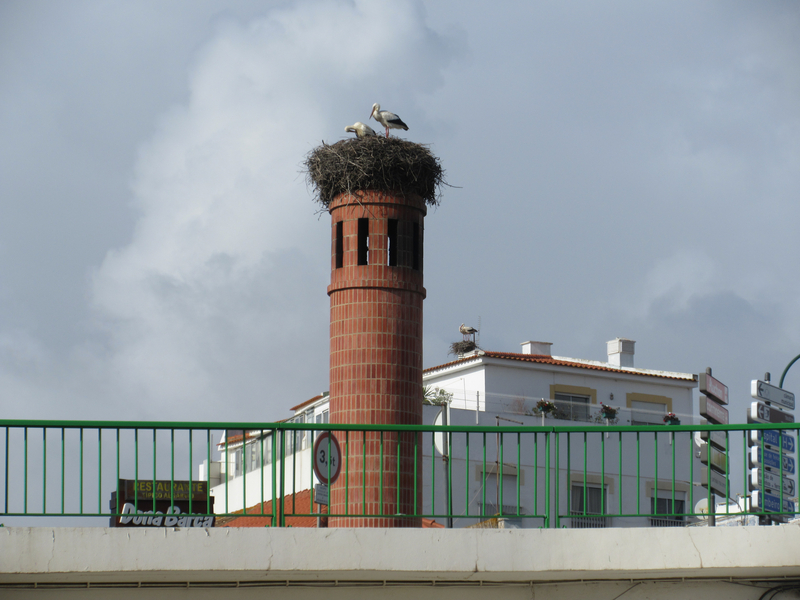 Wood storks: The Portuguese are not particularly fond of them because they eat and destroy the crops. Their nests are huge, as are they, and their sound is like no other bird I have ever heard, especially their mating sounds. They are also known as White Storks.