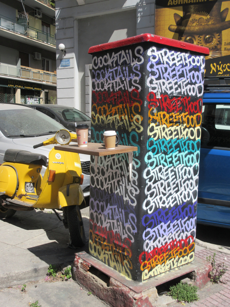 Our short stay in Athens was rounded off with a superb meal at a local restaurant, where the owner was decorating the ceiling with an old painted moped and a big smile on his face.