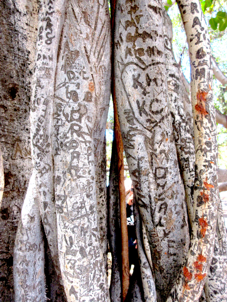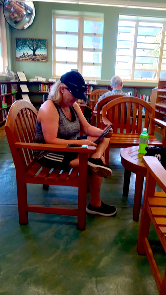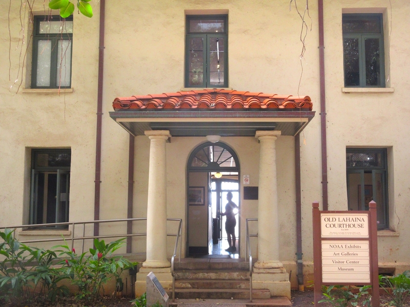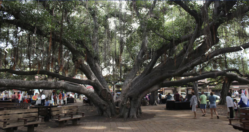 First thing on our agenda was of course the 150 year old world famous Banyan Tree living structure in front of the library and the old courthouse, given to the island by Indian missionaries. Lahaina was the capital of the Hawaiian monarchy in the 1800s, pretty much at the same time the Banyan Tree was planted (1873). Covering 1.94 acres by 2023, the tree resides in Lahaina Banyan Court Park. A mere 8 feet (2.4 m) when planted, it grew to a height of about 60 feet (18 m) and rooted into 16 major trunks, apart from the main trunk, with the canopy spread over an area of about 0.66 acres (0.27 ha). It is considered the largest banyan tree in the USA. The library would give us Wifi access and the tree would provide shade. It was a beautiful morning as the stores opened.